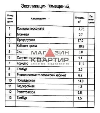 Продажа нежилого помещения, общей площадью 85 кв.м. Адрес: г. Смоленск, ул. Попова, д.112 Первый этаж жилого дома, отдельный вход, 4 кабинета с окнами и мокрыми точками. Центральные коммуникации: электроснабжение выполнено по действующим требованиям для медицинских учреждений: два кабеля (основной и дублирующий) 380 В (3 фазы), приточная и вытяжная система вентиляции, пожарная сигнализация, охранная сигнализация. На окнах - рольставни. Ранее в этом помещении располагался стоматологический кабинет (имеется помещение лицензированное под рентген). На данной площади организованы следующие помещения:- регистратура (ресепшн);- 2 кабинета;- рентгенстоматологический кабинет;- гардероб;- санузел;- душ;- кабинет врача;- моечная;- комната персонала;- 2 тамбура;- коридор. При необходимости продается стоматологическое оборудование:- рентгеновский аппарат «Еvоlutiоn» (Италия);- стоматологические установки «FJ-22» (2 шт.);- стерилизатор воздушный;- стерилизатор паровой;- облучатели бактерицидные (5 шт.);- скальпель ультразвуковой «ТорSеlесtоr»;- лампа светополимеризационная «DТЕ LUХЕ»;- сфигмоманометр;- аквадистилятор;- мойка ультразвуковая «Ультраэст»;- шкафы «Ультралайт» (3 шт.);- слюноотсос и прочее. Расположено на первой линии в густонаселенном жилом микрорайоне. Рядом идет активное многоэтажное жилое строительство. Интенсивный пешеходный и автомобильный трафик. Напротив вместительная парковка. Подробнее по тел