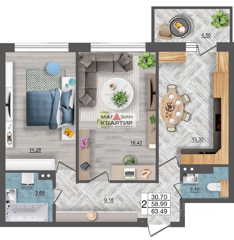 2-комн. квартира, 63,49 м² ЖК «Океан»