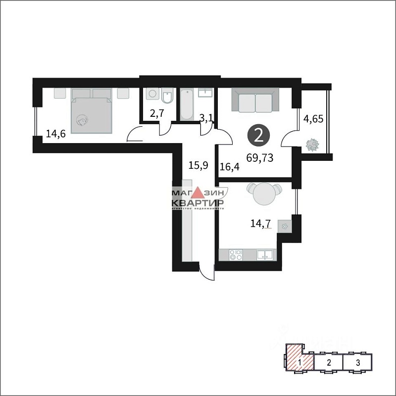 Площадь: 69.63 / 31 / 14.6