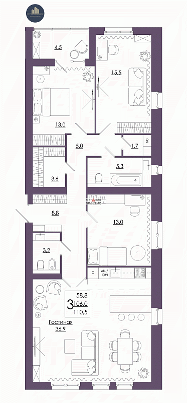 Предлагается 3ком. кв. в элитном жилом комплексе "Мастер и Маргарита". Все квартиры в доме имеют свою уникальную планировку. Большая кухня гостиная 36,9 кв.м., три спальные комнаты, три с/у, лоджия с панарамным видом.